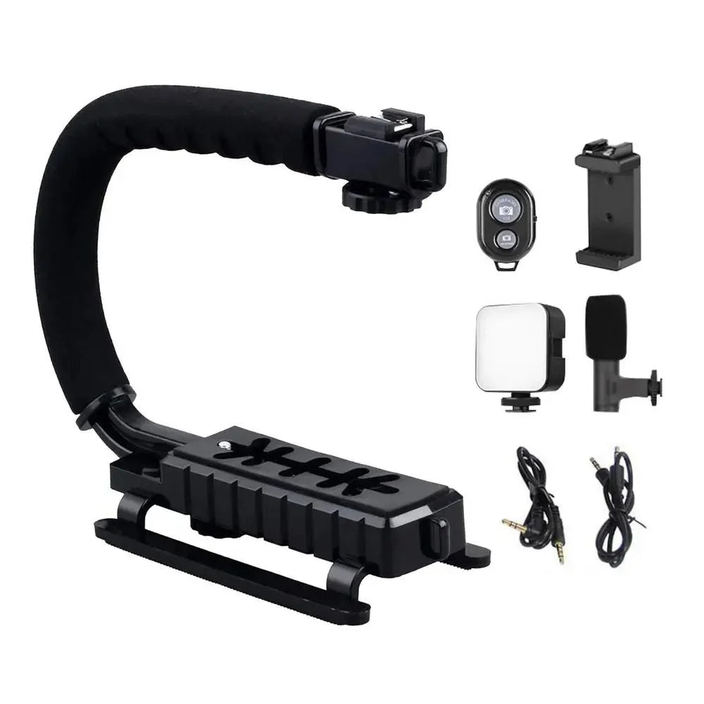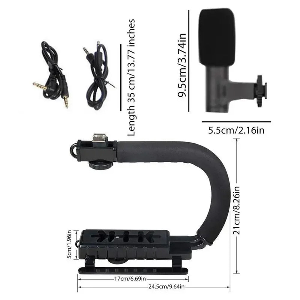 Universal Video Rig-AY-49U MicRig video and audio grip is designed to work with DSLRs, Camcorders, Gopros and Smartphones to create high quality video recordings. Unlike traditional, heavy, video handles and recording equipments,this grip combines both audio and video functions for less than half the weight, effectively relieving fatigue-especially on long shoots. The MicRig combines a built-in stereo microphone, which provides high-quality audio pick-up while shooting, with the versatility of a low-angle grip and top-mounted, universal cold shoe for attaching accessories like LED lights and LCD monitors.
